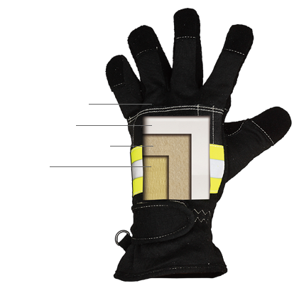 Наружная ткань Наружная ткань сделана из ОС кожи ламинированной тканью из оксидированного ПАН волокна и Kevlar. Ткань огнестойкая, порезозащитная, износостойкая, антискользская, усиливает защиту от механических опасных предметов и защитные жаропрочные свойства.