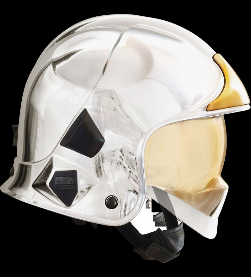 結構性消防用消防帽。一體成型外殼,前方有金色鐵片,配有面具夾扣固定座、及燈座,具防撞擊內盔及內襯軟墊,頭圈內含填充物料和皮革內裡,頸背有皮革緩衝墊,可調整頭圈旋鈕(專利設計),透明護目鏡及黃金鍍膜處理防護面鏡。 |